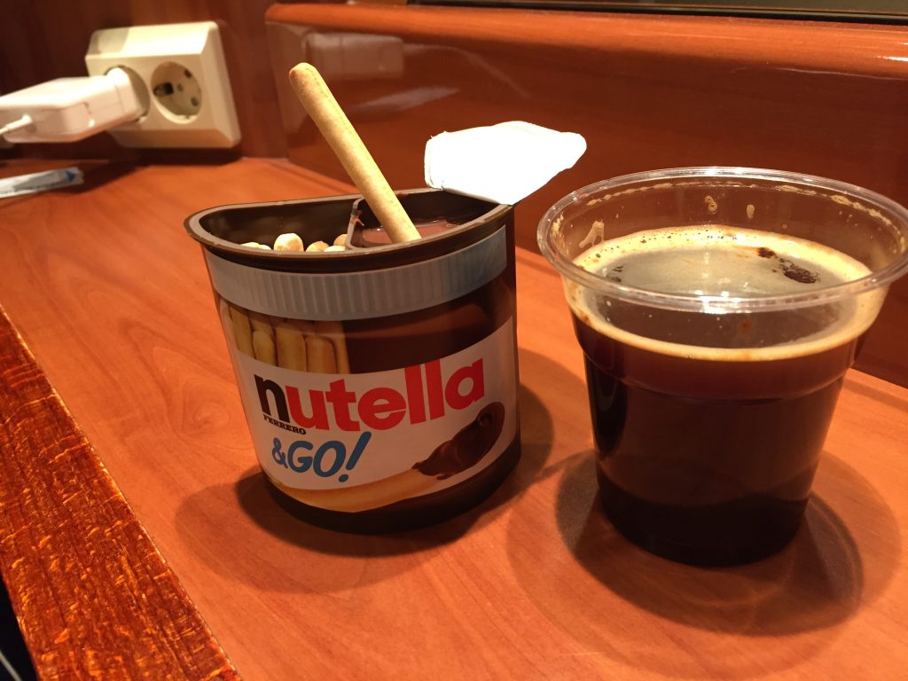 Op tijd weer op, ook aan boord vd ferry. Gewoon werken vanaf zee. Een geïmproviseerd ontbijt met warm(kraan)water oploskoffie en Nutella dip stickjes uit de tax free shop. Vooral om dingen op gang te brengen natuurlijk.