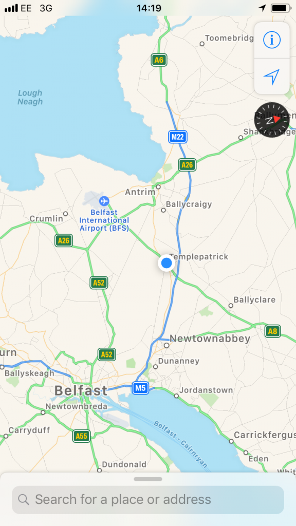 Gelukkig ging ik al op tijd met de bus naar het vliegveld om daar wat te werken. Na ongeveer 10 minuten kwam ik erachter dat het de bus naar Belfast International Airport was. Dat vliegveld ligt op 40 minuten rijden (!) van Belfast, vlak bij het plaatsje Antrim.