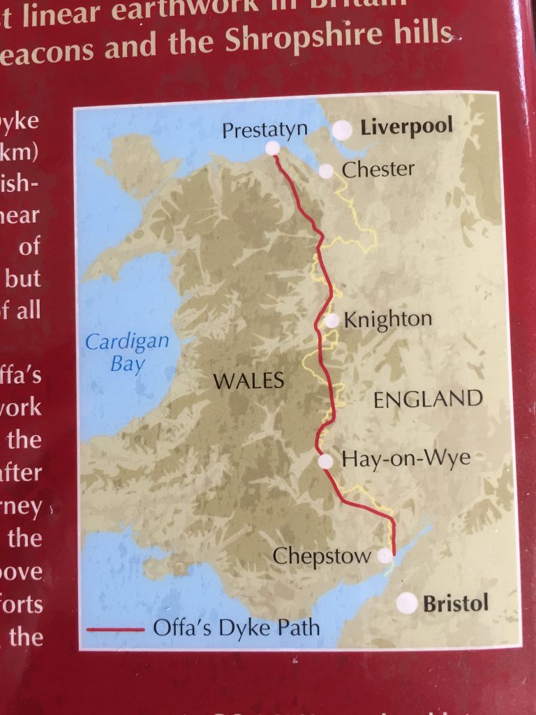 We lopen natuurlijk niet zomaar van zuid naar noord, we volgen Offa’s Dyke Path. Een lange afstands route zoals the South West Coastal Path. Maar dan niet langs the South Coast maar, inderdaad, langs Offa’s Dyke. Min of meer een historische grens tussen Wales en Engeland. Maar later meer daar over.